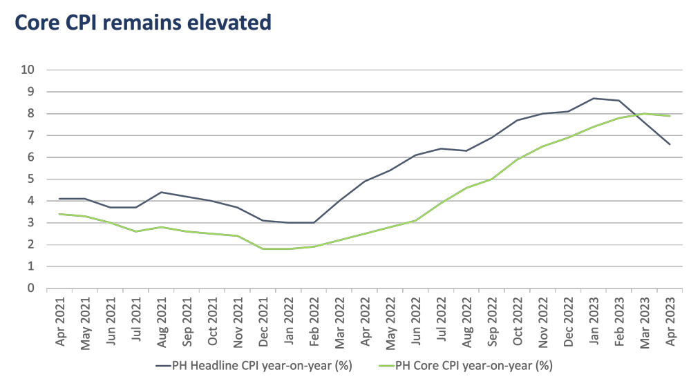 The Philippines’ CPI has since come down to 6.6% in April 2023 from a high of 8.7% in January 2023. However, despite the downward trend in headline inflation, the core CPI, which excludes volatile oil and food prices, has remained stubbornly elevated at 7.9%.