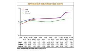 Bond yields, which move opposite to prices, declined by an average of 5.54 basis points (bps) week on week, based on PHP Bloomberg Valuation Service Reference Rates as of July 21 posted on the Philippine Dealing Systemâs website.