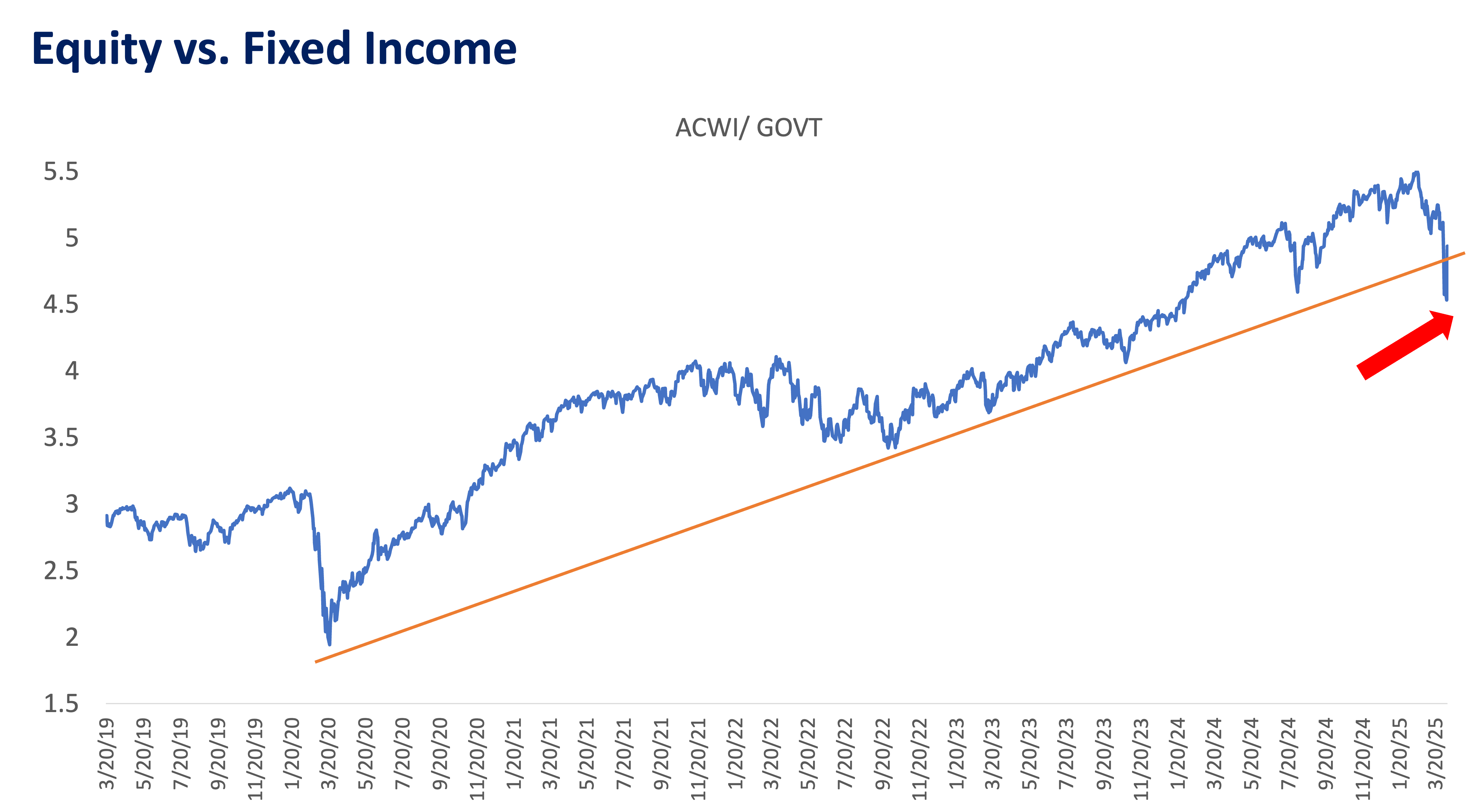 The graph above depicts the relative performance of ACWI ETF (Equity: All Country World Index) versus the GOVT ETF (Fixed Income: US 1 to 30Yr Treasury Bonds). A rising line indicates ACWI outperformance and GOVT underperformance.