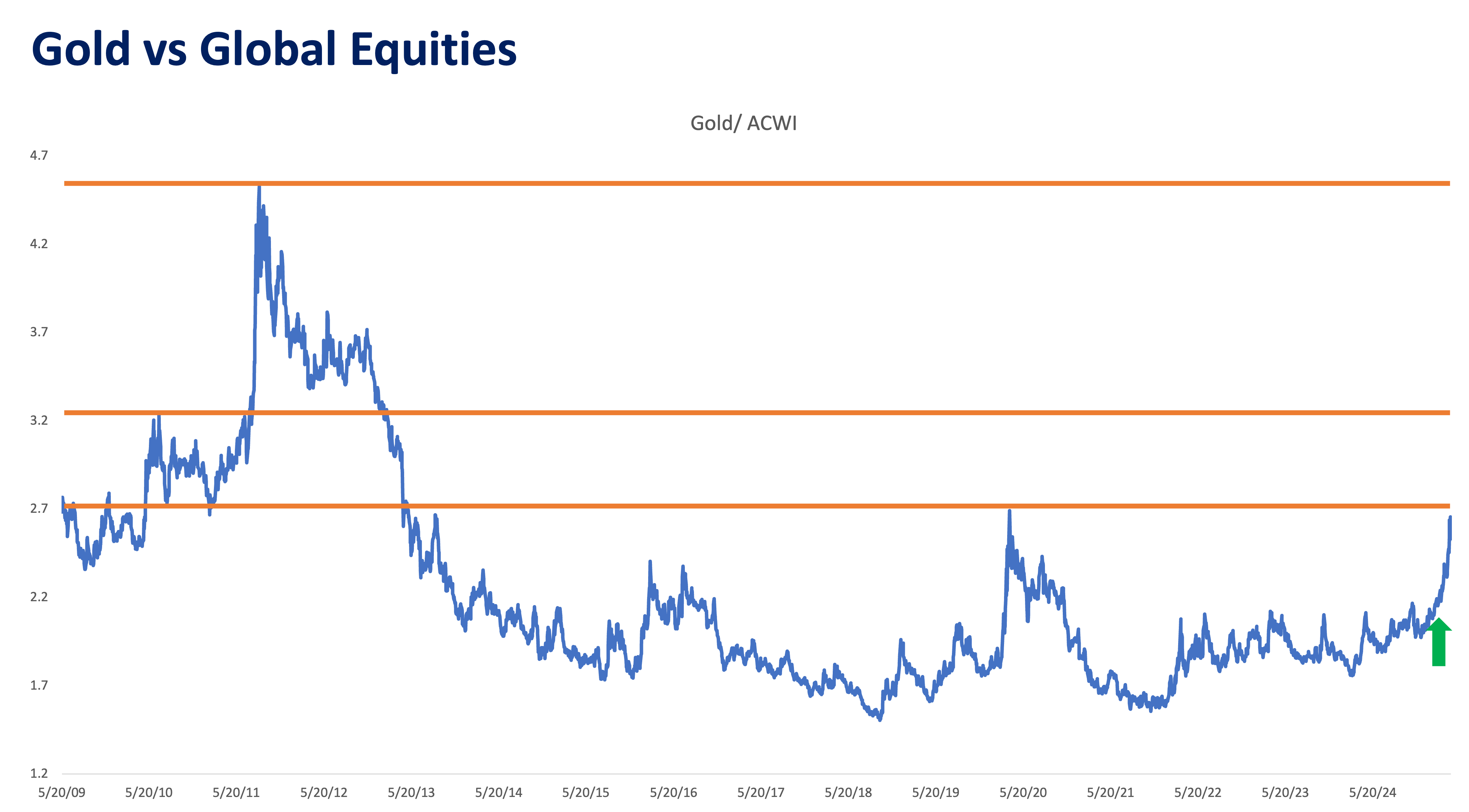 The graph above depicts the relative performance of GLD ETF (Gold) versus the ACWI ETF (Equity: All Country World Index). A rising line indicates gold outperformance and ACWI underperformance.